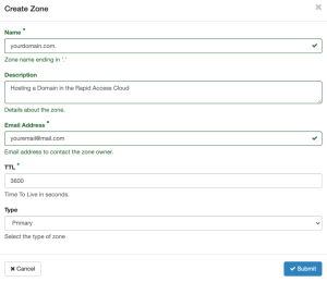 Next, create an A and AAAA recordset. To do this in the Rapid Access Cloud dashboard, do the following steps: